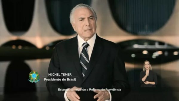 Temer abordou na mensagem a proposta de emenda à Constituição da reforma da Previdência, enviada ao Congresso Nacional em dezembro. Na fala, o presidente afirmou que a reforma tinha o objetivo de garantir que a “sagrada aposentadoria esteja garantida agora e no futuro”.