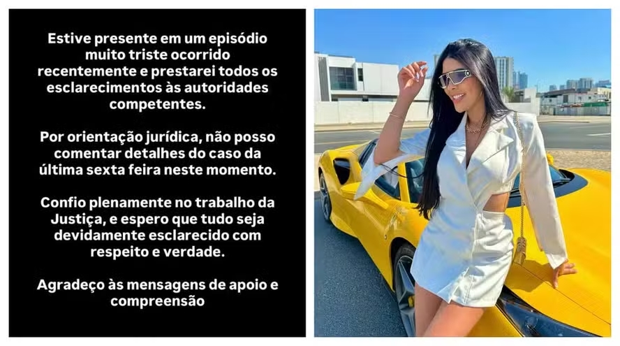 Nina Santos, que tem mais de 680 mil seguidores no Instagram, confirmou presença no carro e afirmou que prestará esclarecimentos às autoridades. A Secretaria de Segurança Pública informou que as circunstâncias do disparo estão sendo investigadas pelo Departamento de Homicídios e Proteção à Pessoa (DHPP), com acompanhamento da Polícia Militar.