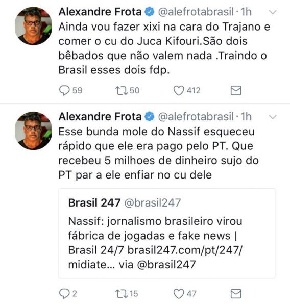 Alexandre Frota ataca com palavrões e ofensas Fátima Bernardes, Juca Kfouri, Luis Nassif e José Trajano