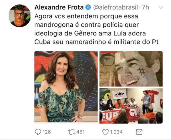 Neste sexta-feira (3), Frota voltou a carga e postou uma série de palavrões e acusações direcionados aos jornalistas José Trajano, Juca Kfouri e Luis Nassif. Além disso, sobrou também para Fátima Bernardes, a chamando de “mandrogona”. Na verdade, a palavra correta é mondrongona, que quer dizer uma pessoa disforme, um monstrengo.