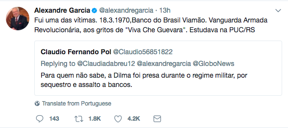 Alexandre Garcia conta lorota de que foi vítima de assalto a banco em 1970 organizado por grupo de Dilma