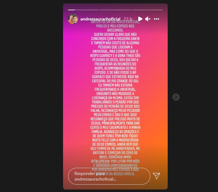 “Estou sim trabalhando o perdão, porque preciso do perdão de Deus”, escreveu Andressa.