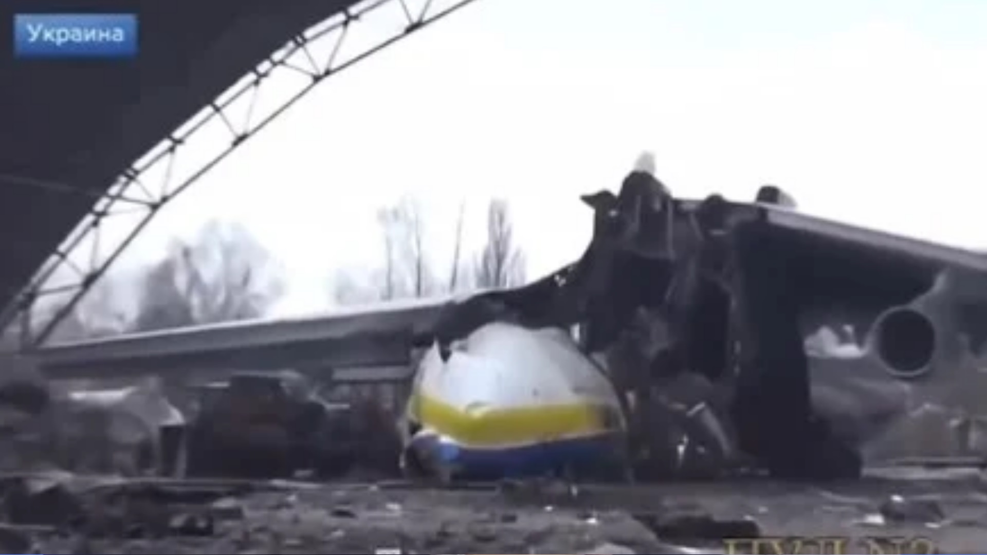 TV estatal russa mostra as primeiras imagens do Antonov An-225 totalmente destruído.