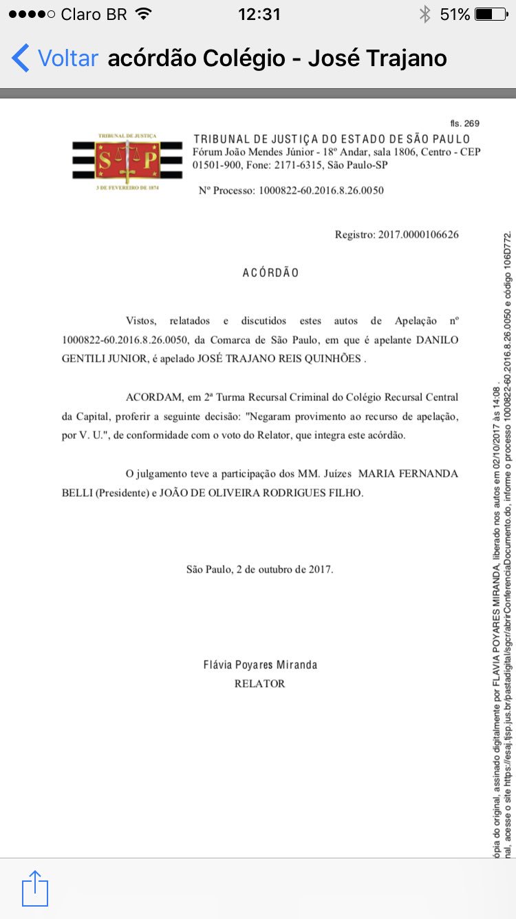 Nesta terça, dia 10, o jornalista escreveu no Twitter: “Trajano 2×0 Gentili! Placar final . Agora não cabe mais apelação. Queixa-crime rejeitada”.