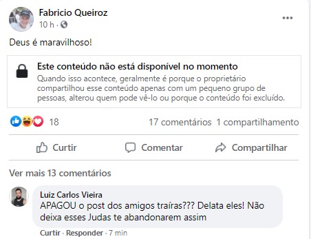 Fabricio Queiroz deve ter se arrependido do post, das declarações feitas nos comentários e também da repercussão. Tanto que ele deletou tudo.