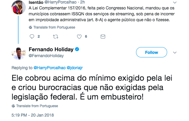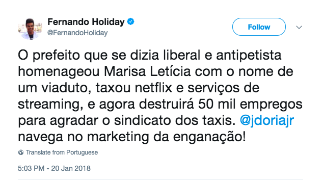 O franco atirador da turma é o vereador Fernando Holiday (DEM-SP). Holiday finge que está bravo com o prefeito por causa da resolução que regulamentou o Uber. “É um completo devaneio que vai contra tudo aquilo que ele pregou durante a campanha e no início da sua gestão”, afirma.