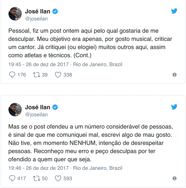 O comentário rendeu uma série de críticas e, ontem ele voltou à rede social para pedir desculpas pelo post.