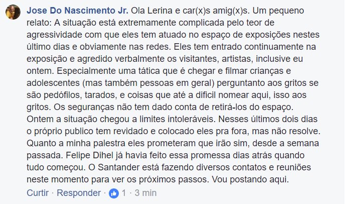 O Jornal do Comércio buscou informações junto ao Santander Cultural, mas só obteve informações da segurança, presente na portaria do local, de que de fato a exposição, que funcionaria das 14h às 19h neste domingo, está fechada em razão de “imprevistos” ocorridos ontem. No início da tarde, o Santander Cultural emitiu uma nota em que afirmou estar recebendo diversas manifestações críticas a respeito da exposição e confirmou o encerramento da mostra neste domingo.