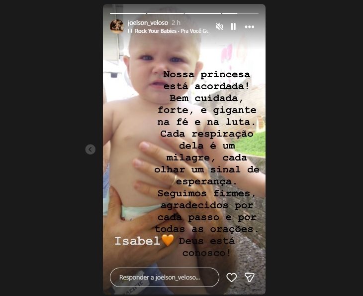 “Ela está bem, consciente, bastante emotiva e chorando”, disse Lucas, ao informar que a jovem passará por procedimento para retirada do tubo. O pai também relatou a melhora ao afirmar: “Nossa princesa está acordada! Bem cuidada, forte, e gigante na fé e na luta”.