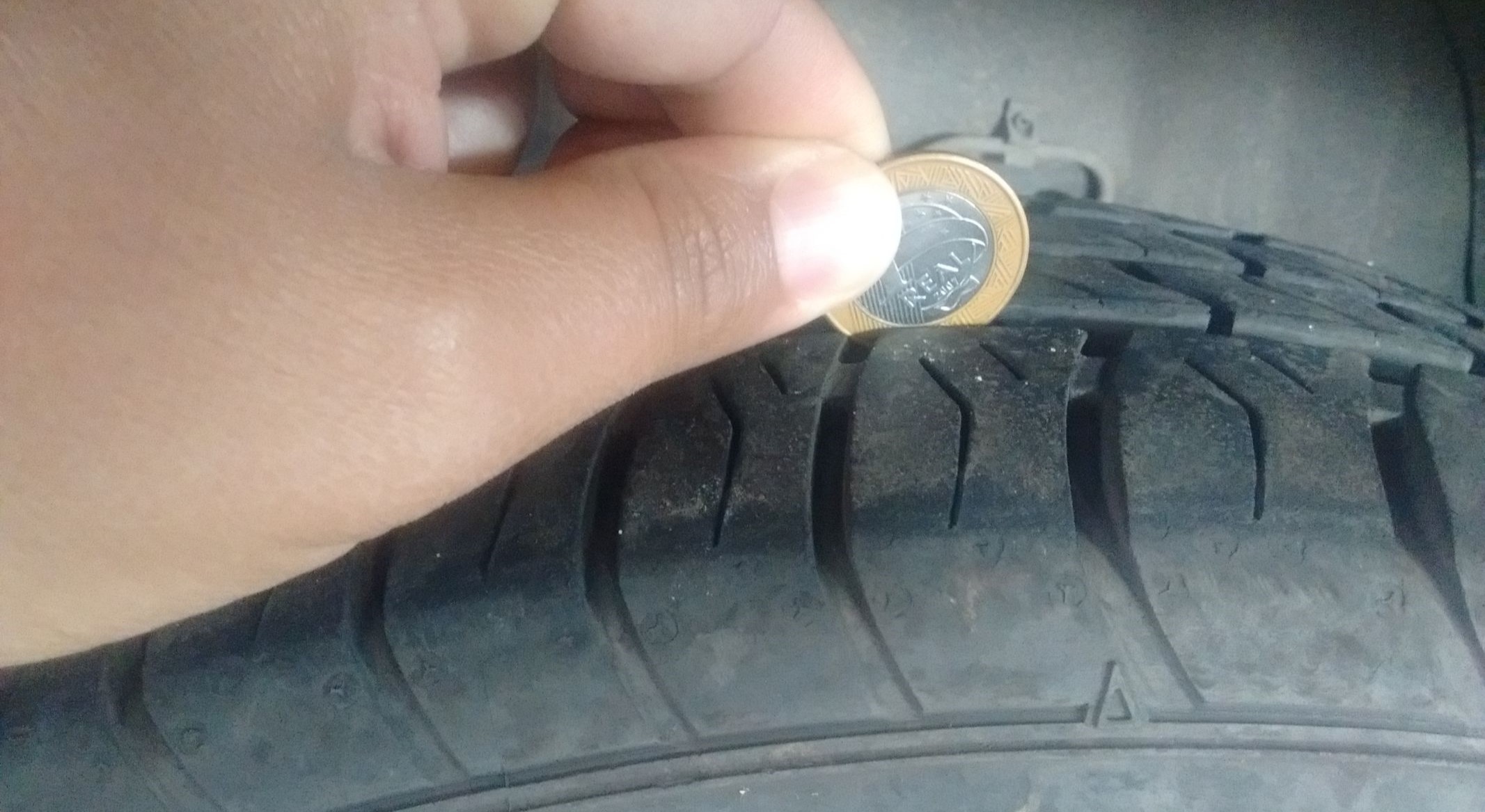 O teste é fácil: insira a moeda no sulco do pneu com o número voltado para baixo. Se a borda prateada ficar visível, o desgaste está avançado e o pneu deve ser substituído. Caso a borda desapareça, ele ainda tem profundidade suficiente para rodar com segurança.