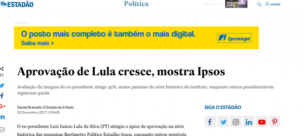 O ex-presidente Luiz Inácio Lula da Silva (PT) atingiu o ápice de aprovação na série histórica das pesquisas Barômetro Político Estadão-Ipsos, enquanto outros possíveis candidatos, como Geraldo Alckmin (PSDB), Marina Silva (Rede) e Jair Bolsonaro (PSC), sofrem desgaste na imagem. Em dezembro, Lula teve seu sexto mês seguido de melhora na avaliação, chegando a 45% de aprovação. A parcela da população que o desaprova, no entanto, ainda é maior: 54%.