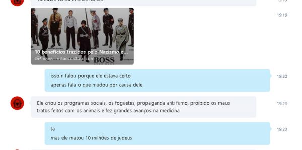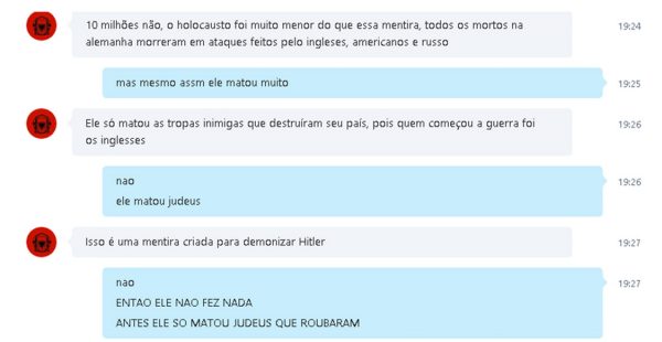 Logo depois do ocorrido, o pai de um dos melhores amigos do jovem decidiu vasculhar as conversas que o filho mantinha com o atirador na internet e se deparou com as mensagens divulgadas abaixo. Pelo teor do bate-papo, travado entre abril e outubro deste ano no Skype, é possível concluir que o garoto tirava tais ideias de sites de notícias falsas e de teorias da conspiração, como as que propagam que o holocausto dos judeus foi uma farsa e que as imagens dos campos de concentração foram montadas.