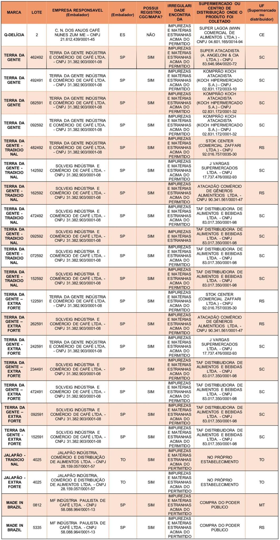 Segundo o Mapa, exames realizados em unidades da Laboratórios Federais de Defesa Agropecuária detectaram “matérias estranhas e impurezas acima dos limites previstos em norma”. Diante do resultado, a pasta determinou a declassificação das marcas envolvidas e o recolhimento imediato dos lotes irregulares.