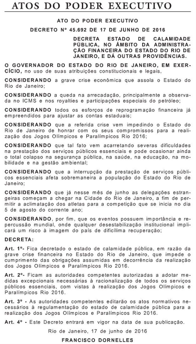 O governador em exercício do Rio, Francisco Dornelles, decretou nesta sexta-feira (17) estado de calamidade pública. O decreto, publicado no Diário Oficial, destaca a grave crise financeira, que impede o cumprimento das obrigações assumidas em função da Olimpíada e Paralimpíada. O texto reforça que o governo teme um “total colapso na segurança pública, na saúde, na educação, na mobilidade e na gestão ambiental”.