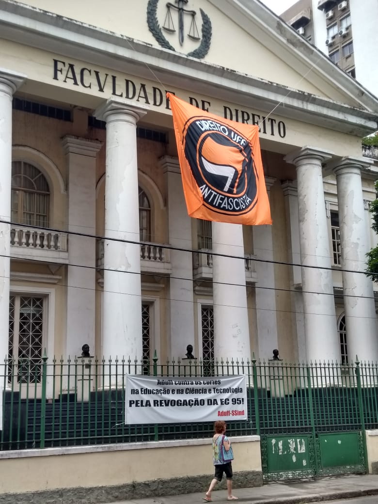 Na tarde de terça, dia 24, fiscais do Tribunal Regional Eleitoral retiraram uma bandeira contra o fascismo que estava pendurada no prédio da Faculdade de Direito da Universidade Federal Fluminense (UFF).