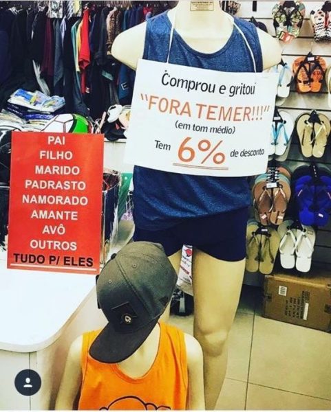 Depois que a Câmara recusou, pela segunda vez, a abertura de investigação contra Temer, caiu a pressão para que o presidente saia. Mas não para esta loja do Saara, o reduto de comércio popular do Centro do Rio. Quem gritar “Fora, Temer” ganha 6% de desconto — mas o grito, veja só, tem de ser em “tom médio”