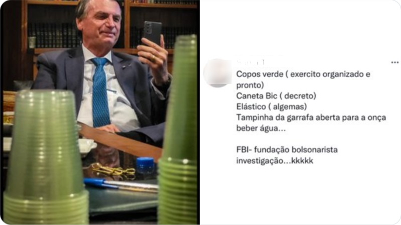 Segundo a mulher, na foto do presidente, os copos verdes demonstram o “exército organizado e pronto”, a caneta Bic mostra o “decreto”, o elástico são as “algemas” e a tampinha de garrafa aberta é “para a onça beber água”.