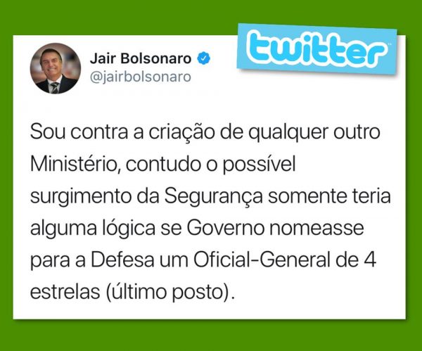 O deputado federal Jair Bolsonaro fez campanha no Twitter pela nomeação de um general para o Ministério da Defesa, reivindicação atendida por Michel Temer. Esse post foi publicado no facebook do deputado em 23 de fevereiro: