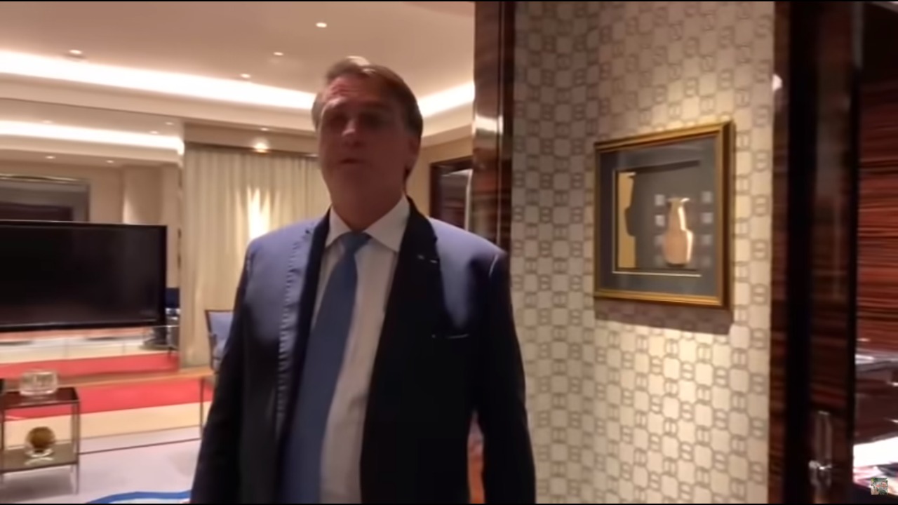 No vídeo, Bolsonaro faz um tour pelo quarto do imóvel em Manama e anuncia: “Amanhã estarei no Catar, a hospedagem também será gratuita. Jamais eu ficaria em um local como esse pago com dinheiro dos brasileiros”.