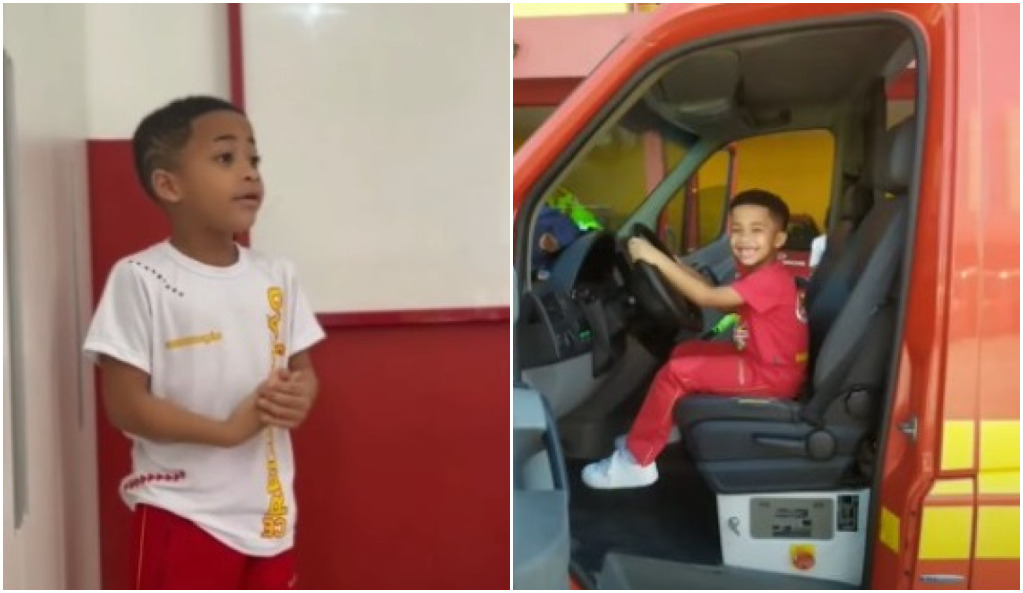 O Corpo de Bombeiros publicou um vídeo do relato do menino e de sua mãe. Veja: