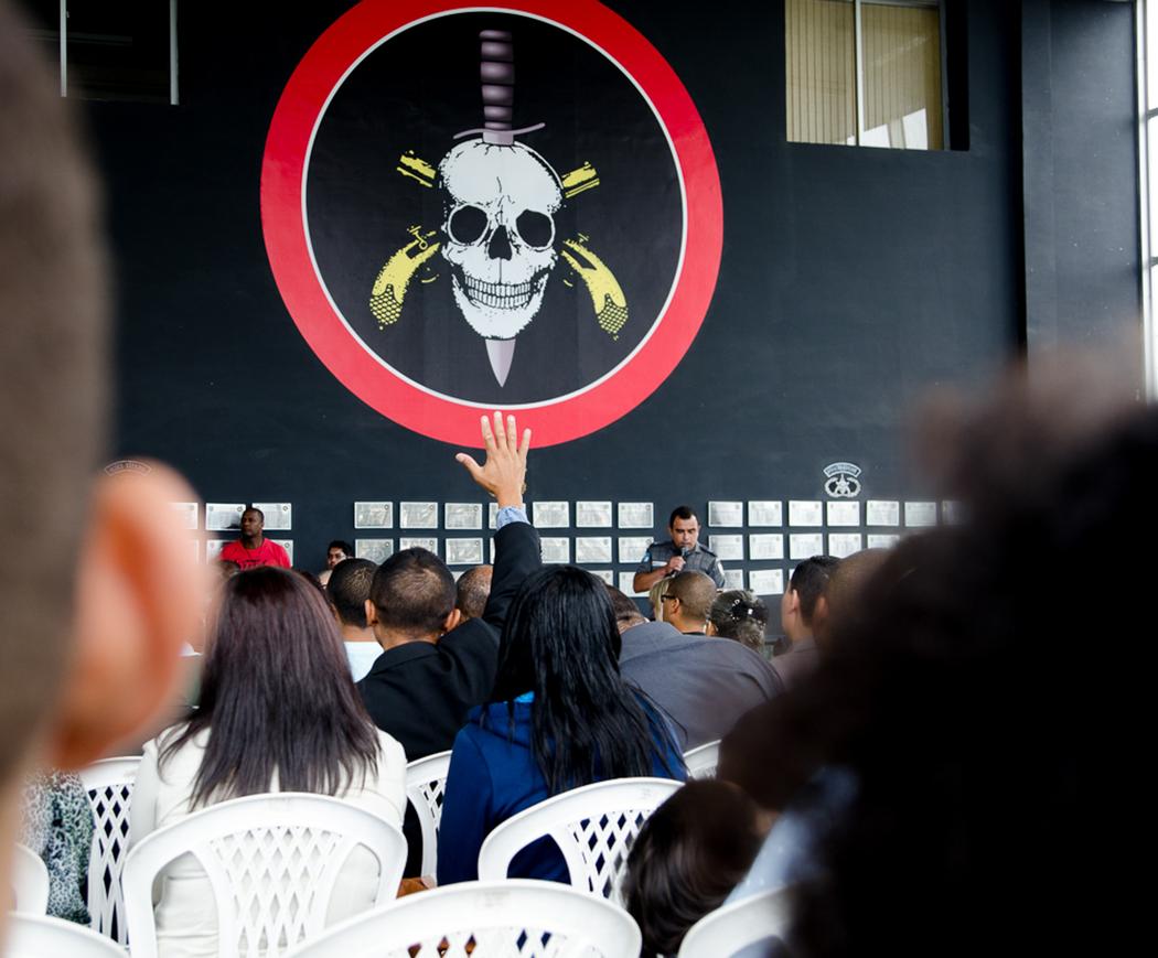 “Alegrei-me quando disseram: Vamos à casa do Senhor”. Uma faca na caveira era o pano de fundo para o salmo enviado pela Congregação Evangélica BOPE que convidava, via Whatsapp, fiéis e suas famílias a conhecerem o novo espaço para cultos, erguido dentro da sede de uma das mais temidas polícias do Brasil, no Rio de Janeiro.