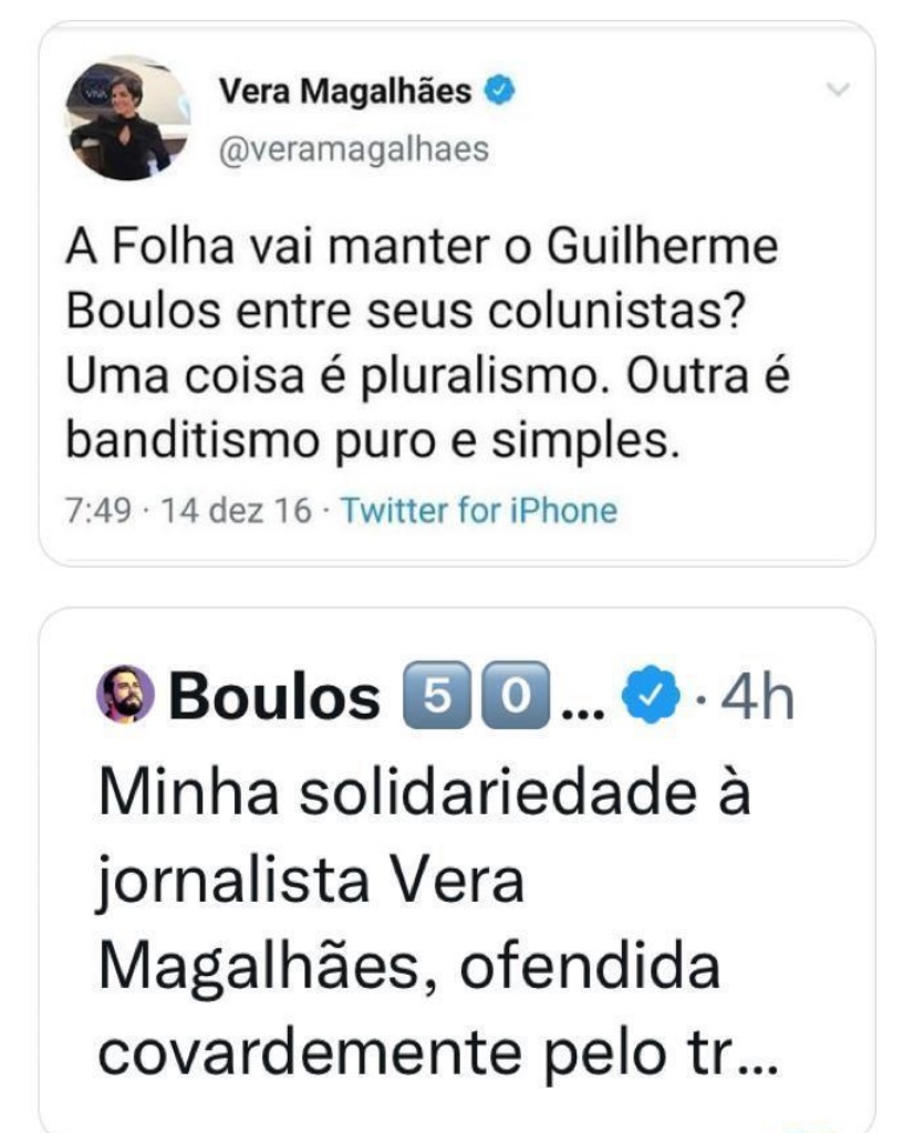 Há seis anos, a jornalista questionou se a Folha de S.Paulo o manteria como colunista e o chamou de bandido. “A folha vai manter o Guilherme Boulos entre os seus colunistas? Uma coisa é pluralismo. Outra é banditismo puro e simples”, disse ela à época.