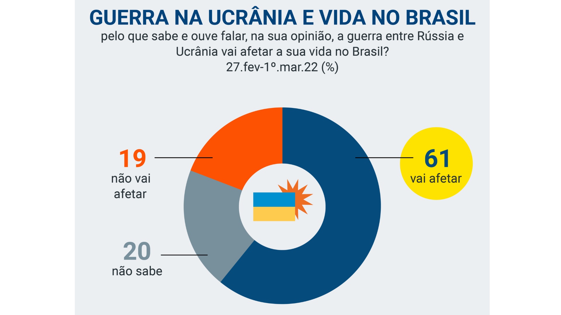Uma pesquisa realizada pelo instituto PoderData indica que 61% dos brasileiros acham que a guerra da Rússia contra a Ucrânia vai afetar a vida no Brasil. O levantamento foi realizado de 27 de fevereiro a 1º de março de 2022.