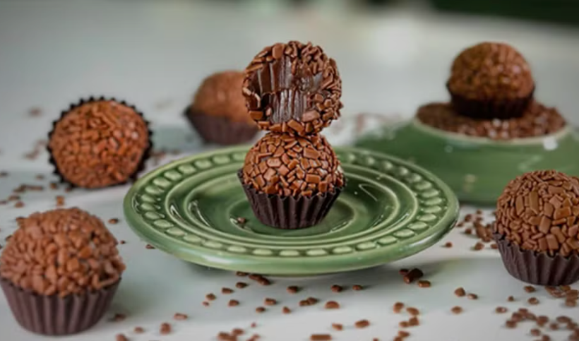 O brigadeiro gourmet utiliza leite condensado, manteiga e chocolate de boa qualidade aquecidos em fogo baixo. A mistura engrossa gradualmente.