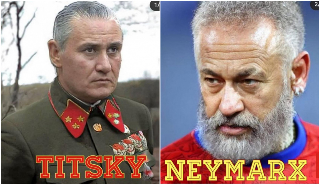 Caiu na rede uma montagem na qual o técnico Tite e o jogador Neymar aparecem como “Titsky”, em referência a Trotsky”, e “Neymarx”, em referência a Marx.