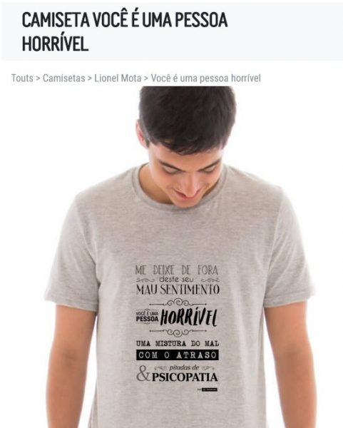 Sabe a sugestão de estampa, que saiu aqui quinta, com uma frase disparada pelo ministro Luís Roberto Barroso contra o colega Gilmar Mendes, no STF? Pois bem. Fez tanto sucesso nas redes, que o autor da brincadeira, o designer Lionel Mota, levou a sério. A camiseta “Você é uma pessoa horrível” está à venda no Touts.com.br por R$ 89.