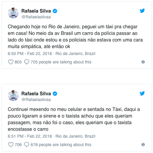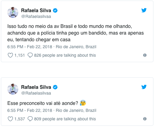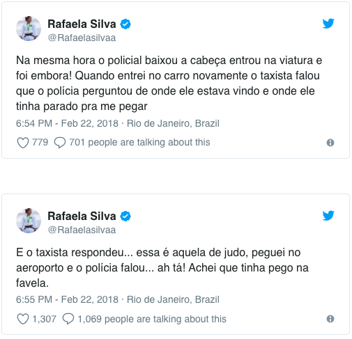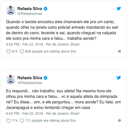 A campeã olímpica Rafaela Silva usou o Twitter e o Instagram para denunciar um caso de preconceito sofrido por ela na tarde desta quinta-feira (22/2), no Rio de Janeiro.