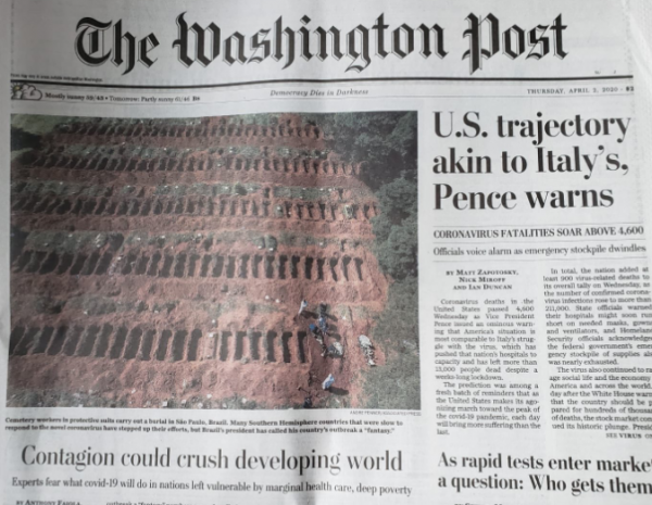 A capa de um dos principais jornais americanos ‘The Washington Post’, surpreendeu os brasileiros ao mostrar um cemitério de São Paulo com centenas de covas abertas.