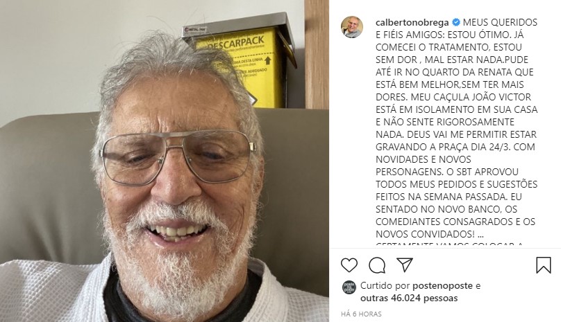 Em publicação em seu perfil no Instagram, o apresentador disse estar ótimo, sem dor e que já começou um tratamento. Afirmou que o filho, João Victor, que teve diagnóstico positivo para covid-19 depois de uma viagem está em isolamento em casa.