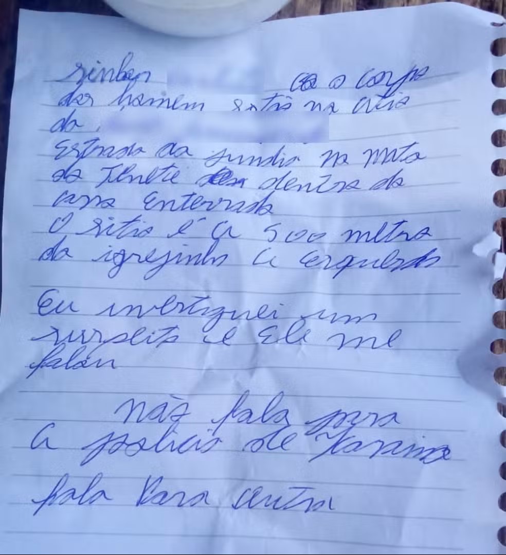 A carta, deixada em frente à casa do pai de uma das vítimas, apontava o local onde estariam “os corpos dos homens” e indicava um sítio na Estrada da Jundiá. Apesar da pista, apenas o carro foi achado e levado para perícia. As investigações apontam como principais suspeitos Antonio Buscariollo, de 66 anos, e seu filho Paulo Ricardo Costa Buscariollo, de 22.