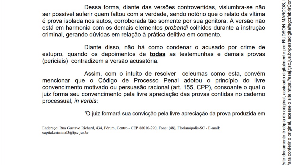 O juiz aponta que não há provas suficientes para condenar o acusado.