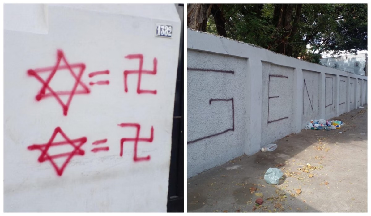 Na sexta-feira (15), o Cemitério Israelita de Belo Horizonte, Minas Gerais, amanheceu pichado com suásticas nazistas, frases como “Israel genocida”, “assassinos” e “Palestina”, além de comparações entre a estrela de Davi e o símbolo nazista. O gestor de segurança do local relatou que as câmeras registraram parte da ação, por volta de 1h50, e identificaram um suspeito – homem branco, cabelos pretos, estatura mediana, aparentando cerca de 40 anos – que ainda teria arremessado três latas de tinta spray dentro do cemitério.