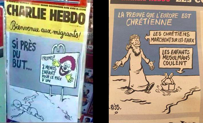 O Charlie Hebdo voltou a criar polêmica com duas charges. Uma delas mostra o menino Aylan Kurdi na praia turca onde se afogou e a legenda: “Tão perto do objetivo…”. Um cartaz na praia assinala: “Promoção! 2 menus pelo preço de um.”
