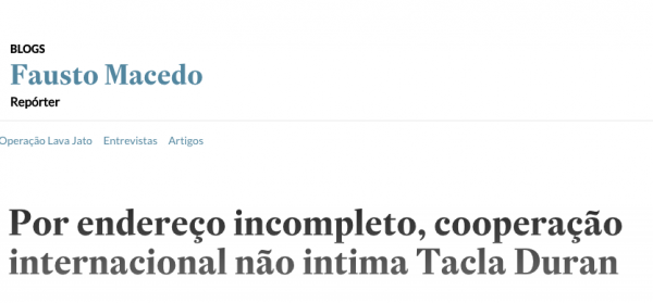 Moro tentou citar Rodrigo Tacla Duran na Espanha, mas, segundo noticia a coluna de Fausto Macedo no jornal O Estado de S. Paulo de hoje, o endereço dele estava incompleto. Por isso, Tacla Durán não foi citado. Estranho, muito estranho. O endereço completo e correto de Tacla Duran consta no documento de identidade espanhol, nos autos da extradição de que Moro tem cópia, porque a solicitou. Além disso, Tacla Durán já foi encontrado neste endereço, através da Rogatória 2017/04074. A audiência chegou a ser marcada para o dia 4 de dezembro do ano passado, em Madri, a pedido do MPF, Tacla Durán compareceu a um tribunal espanhol, mas os procuradores, não. Ou seja, em outro momento do processo, Tacla Durán foi encontrado. Por que não agora? Duas razões explicam: Moro talvez queira forçar a abertura de um processo à revelia contra ele ou tentar desacreditá-lo e, assim, justificar as inúmeras negativas para que ele fosse ouvido como testemunha de defesa do ex-presidente Lula. Seja qual for o objetivo, tem cheiro de fraude, de armação.