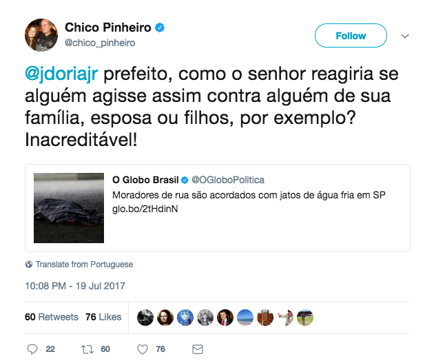 Chico Pinheiro questiona Doria sobre moradores de rua acordados com jatos d’água: “E se fosse alguém de sua família?”