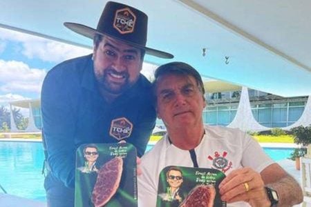 Em um post de domingo (9/5), o churrasqueiro aparece com Bolsonaro e dois pacotes de carne. Na embalagem, uma charge do presidente, o slogan de campanha de Bolsonaro e o nome do frigorífico. A mesma foto está no perfil do Frigorífico Goiás, e a legenda anuncia: picanha Mito.