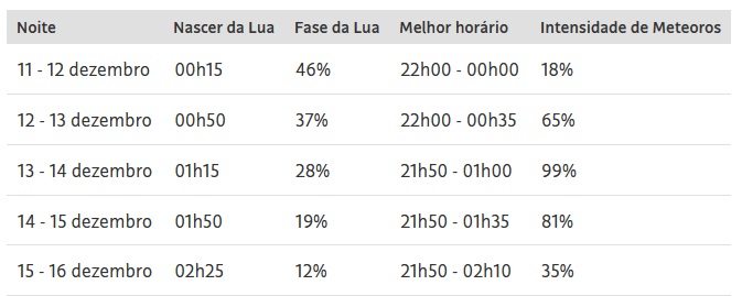 Segundo o ON, em 2025, as melhores condições de visualização ocorrem na região leste da América do Norte e no Caribe. O órgão divulgou uma tabela com os horários mais favoráveis para observação do fenômeno ao longo dos dias de atividade. Confira: