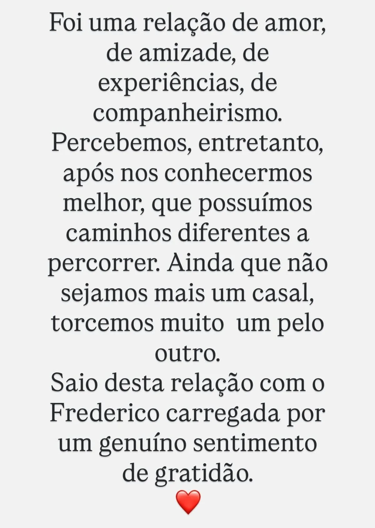 Ela também expressou gratidão pela relação, dizendo: “Saio desta relação com o Frederico carregada por um genuíno sentimento de gratidão”. O deputado Fred Costa, que também usou as redes sociais para confirmar o término, fez uma declaração de amor recente, celebrando o primeiro ano de namoro com Cintia em publicações anteriores, destacando a parceria, admiração e carinho pela influenciadora.