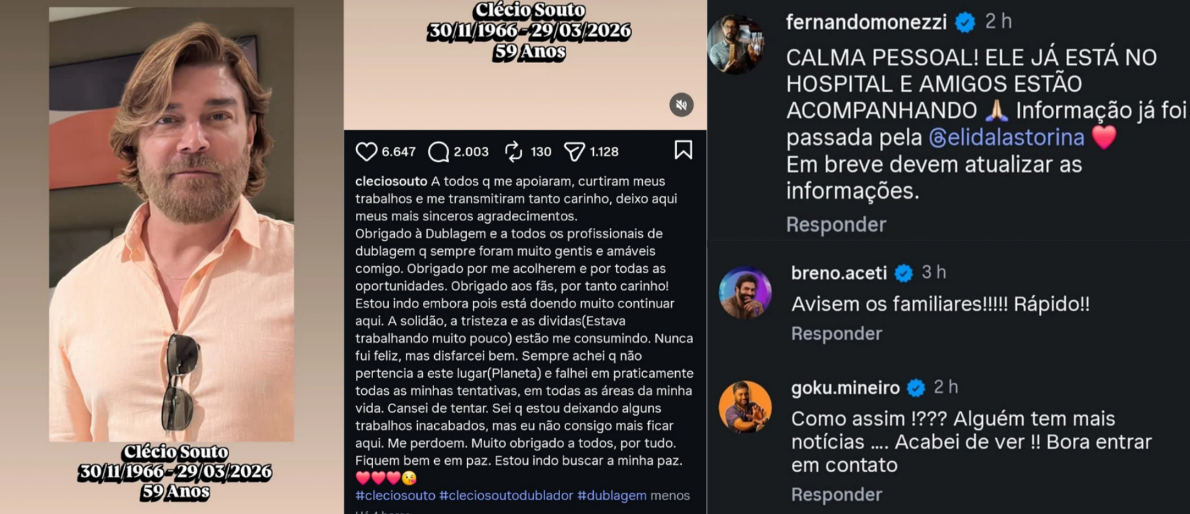 O ator e dublador Clécio Souto foi socorrido às pressas na manhã deste domingo (29) após publicar uma carta de despedida em seu Instagram, deixando amigos e fãs preocupados.