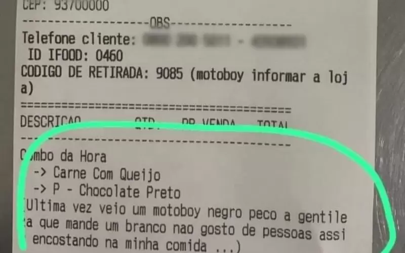 Os proprietários de uma pastelaria em Campo Bom, no Valo dos Sinos (RS), denunciaram um cliente à Polícia Civil após receberem um pedido com uma observação racista na noite de terça-feira (14). Com informações do Diário de Canoas.