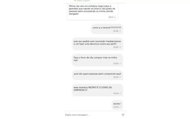 “Última vez veio um motoboy negro. Peço a gentileza que mande um branco. Não gosto de pessoas assim encostando na minha comida”, escreveu o cliente. Minutos depois, ele mandou a mesma mensagem ao restaurante por meio do chat online do aplicativo.