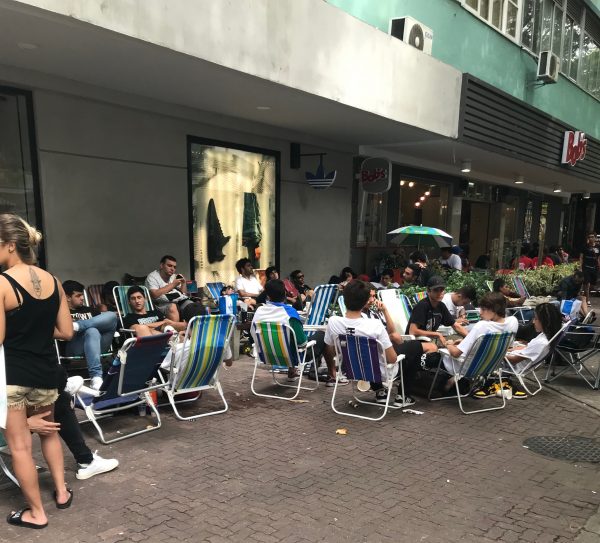 Veja na foto a fila que se formou, desde quinta, na porta da loja da marca, em Ipanema. Segundo um funcionário, “desta vez eles vieram mais cedo”.