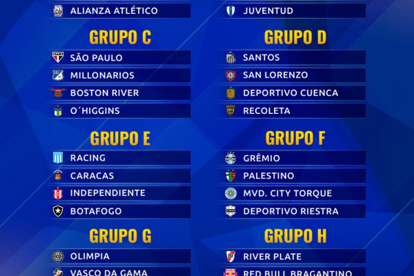Na Sul-Americana, Atlético-MG, São Paulo, Grêmio e Santos lideram os grupos. Red Bull Bragantino e Vasco estão no pote 2, e Botafogo no pote 4. A final será em 21 de novembro. Veja os grupos das competições: