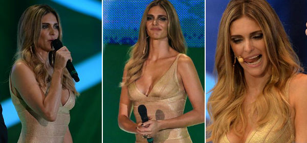 O profuso decote, exposto num vestido dourado da grife Hervé Leger, gerou comentários sobre os seios da apresentadora.