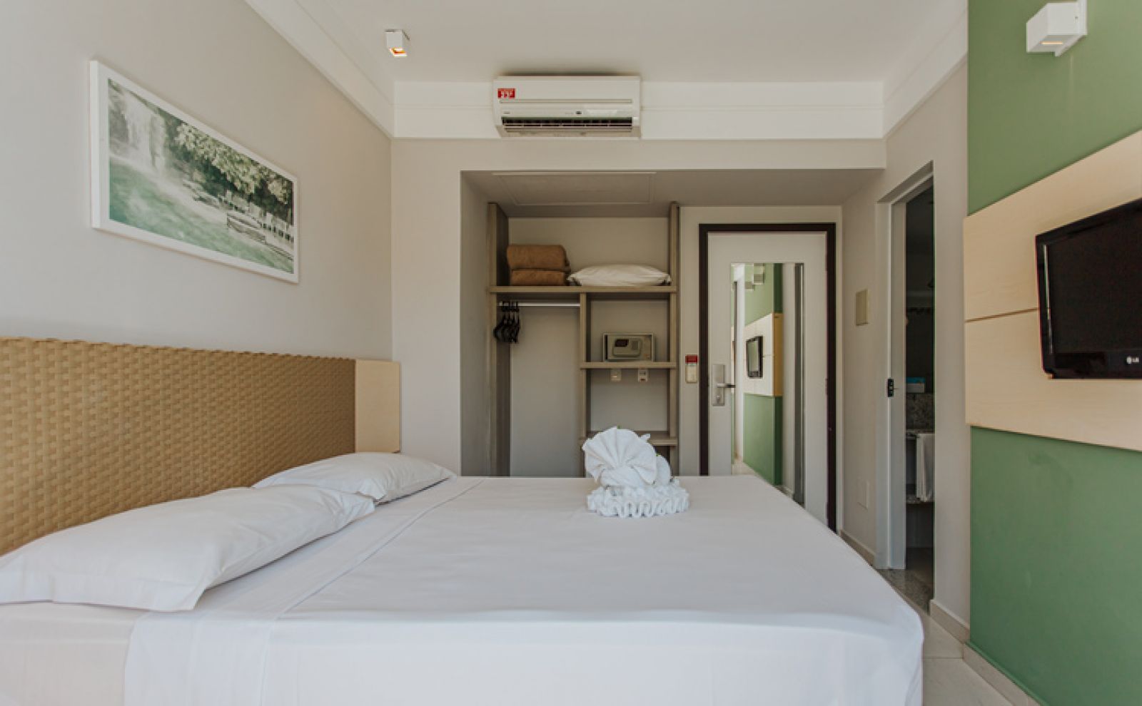 A climatização é programada para manter equilíbrio entre conforto e economia de energia. Sistemas automáticos desligam o ar quando a janela é aberta ou o cartão de presença é removido.
