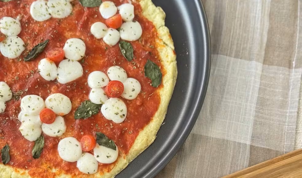 Na versão sugerida por Ana Paula, o recheio inclui molho de tomate, muçarela de búfala, tomate-cereja e folhas frescas de manjericão. Depois de assada novamente, a pizza fica dourada e crocante, pronta para ser servida como alternativa criativa e econômica às massas tradicionais.
